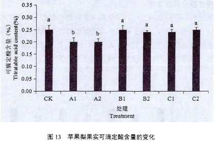(2)套袋處理下的可溶性固形物、可溶性糖、可滴定酸、果實硬度均低于對照。 說明套袋層數(shù)、新高脂膜濃度直接影響了果實的遮光性、透氣性,從而影響了果實的 食用品質。雙層袋果實內含物下降的幅度較單層袋更為明顯,說明該新高脂膜粉劑對 蘋果梨果實內含物的變化有一定作用。